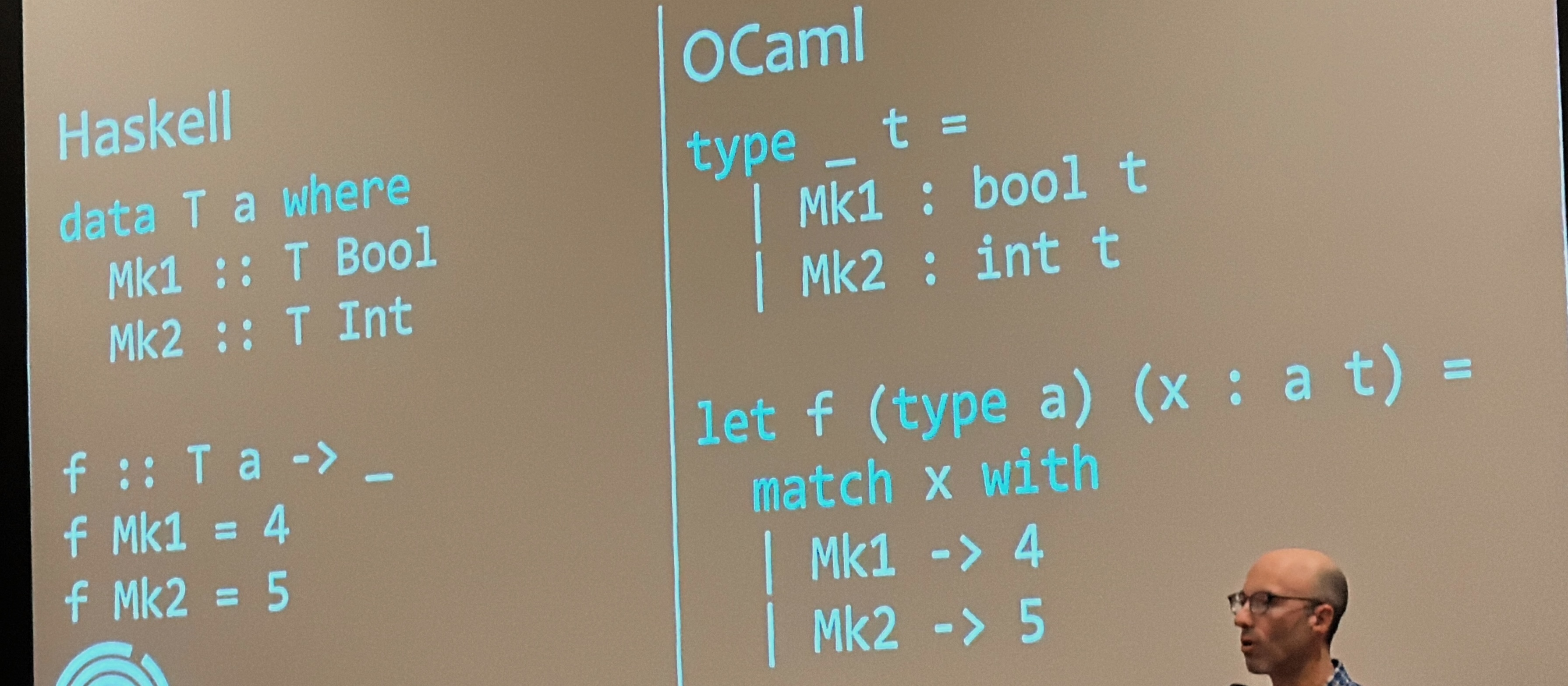 Back in 2014, I stayed up all night before my keynote to the Haskell Symposium trying to encode OCaml functors as Haskell typeclasses and even got help on stage from friendly Haskellers. This year, Richard Eisenberg was my absolute highlight with a superb session on what he's learnt from being the rare breed of someone steeped deeply both in Haskell and OCaml. The room was so packed for this talk that they had to create an overflow room streaming it in the corridors!